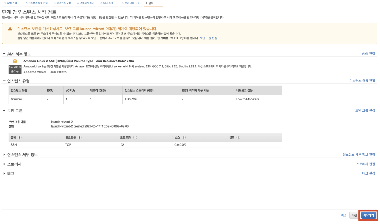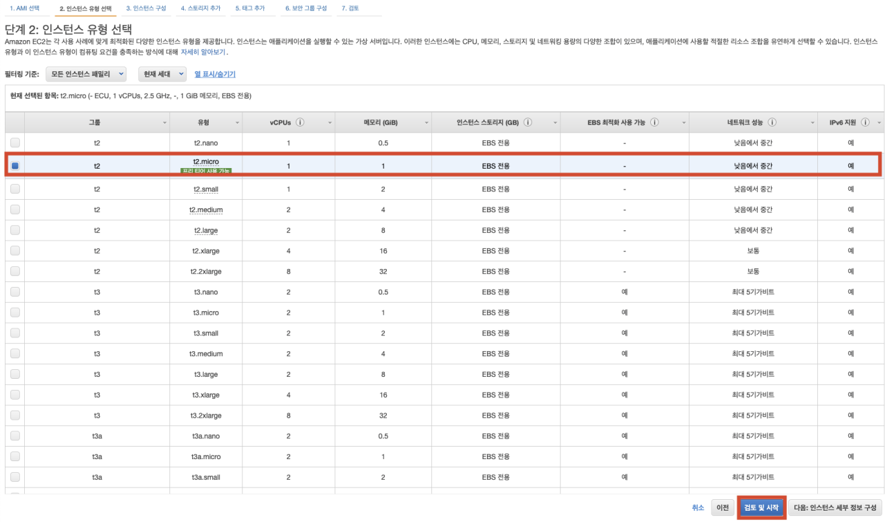 3. t2.micro 선택 및 하단 [검토 및 시작] 버튼클릭