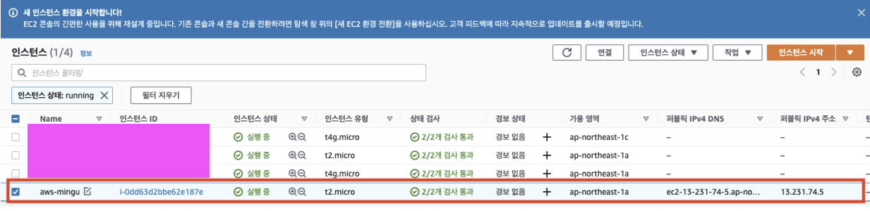 7. key 파일을 chmod를 이용하여 권한을 변경합니다.sudo chmod 400 mingu.pem8. EC2 대시보드에서 생성한 인스턴스의 [퍼블릭 IPv4주소]를 확인합니다.