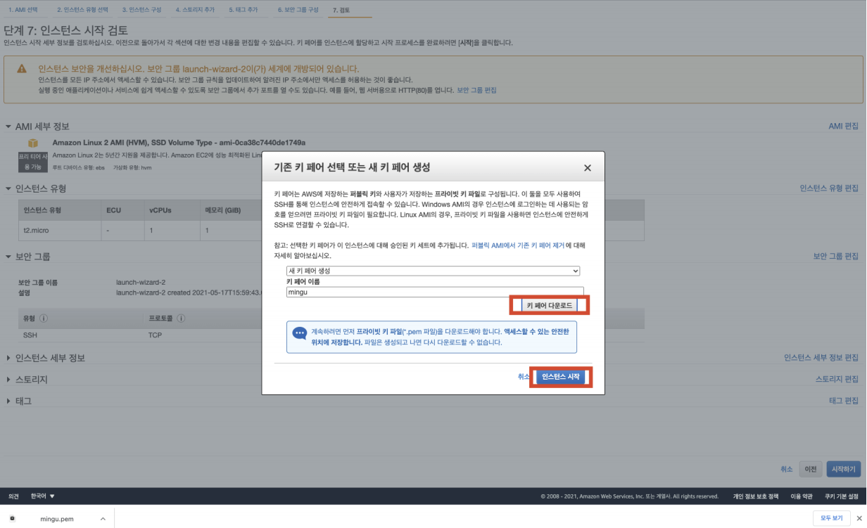 5. 새 키 페어 생성 및 [키 페어 다운로드] 및 [인스턴스 시작]버튼을 누릅니다.