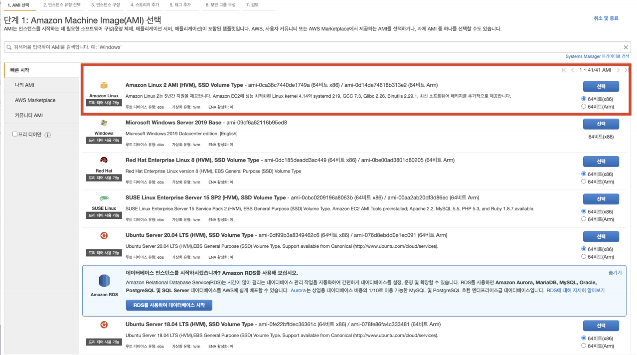 2. Amazon Linux 2 AMI (HVM), SSD Volume Type 선택