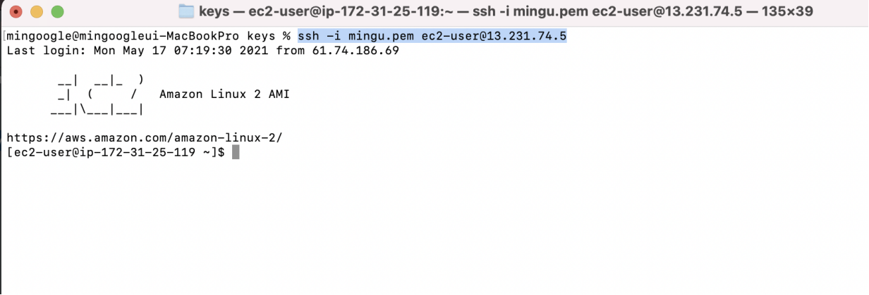ssh -i mingu.pem ec2-user@13.231.74.5정상적으로 접속이 되었다면 다음과 같은 화면이 보입니다.