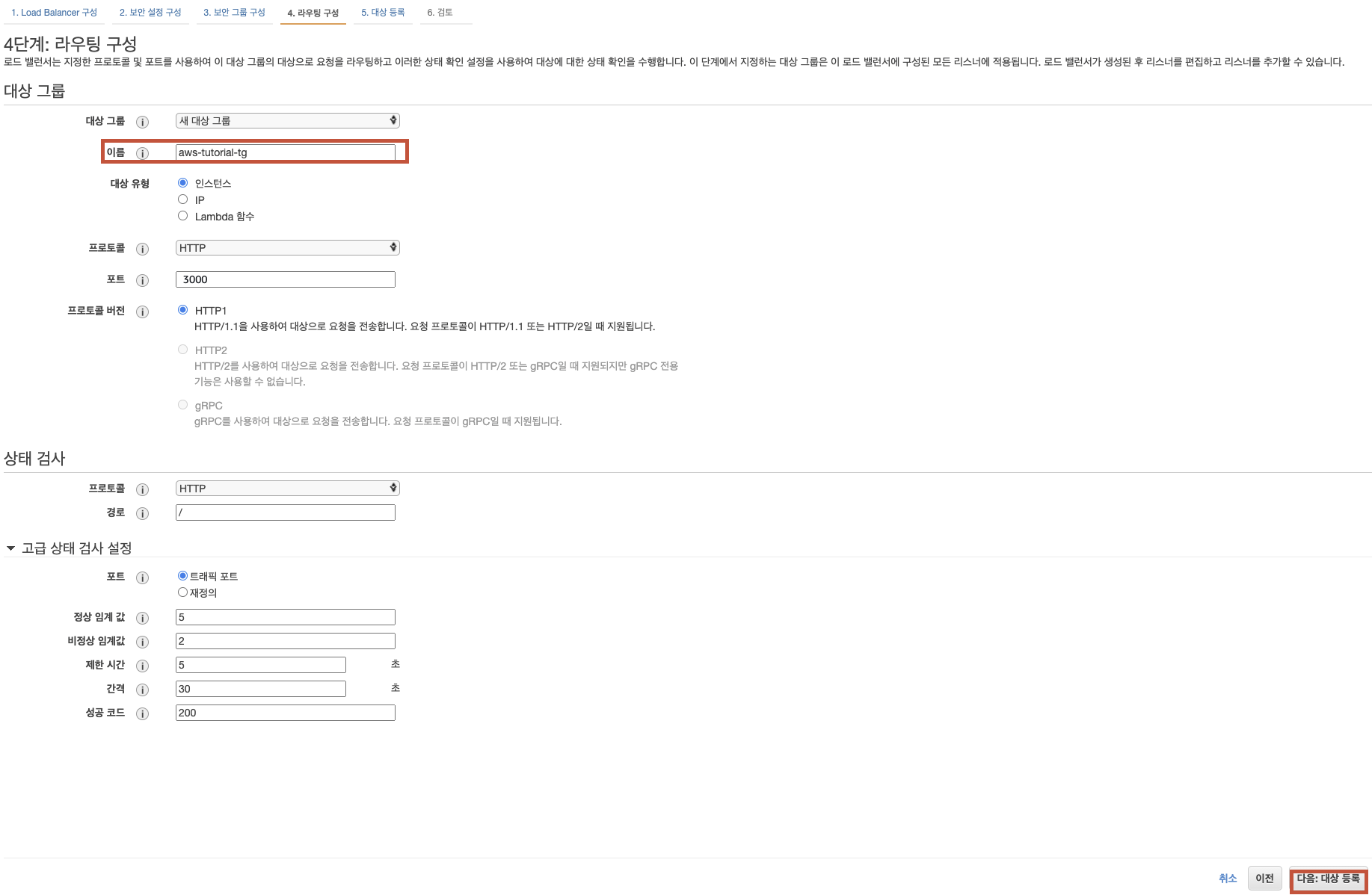 4단계: 라우팅 구성에서 대상 그룹을 생성합니다.