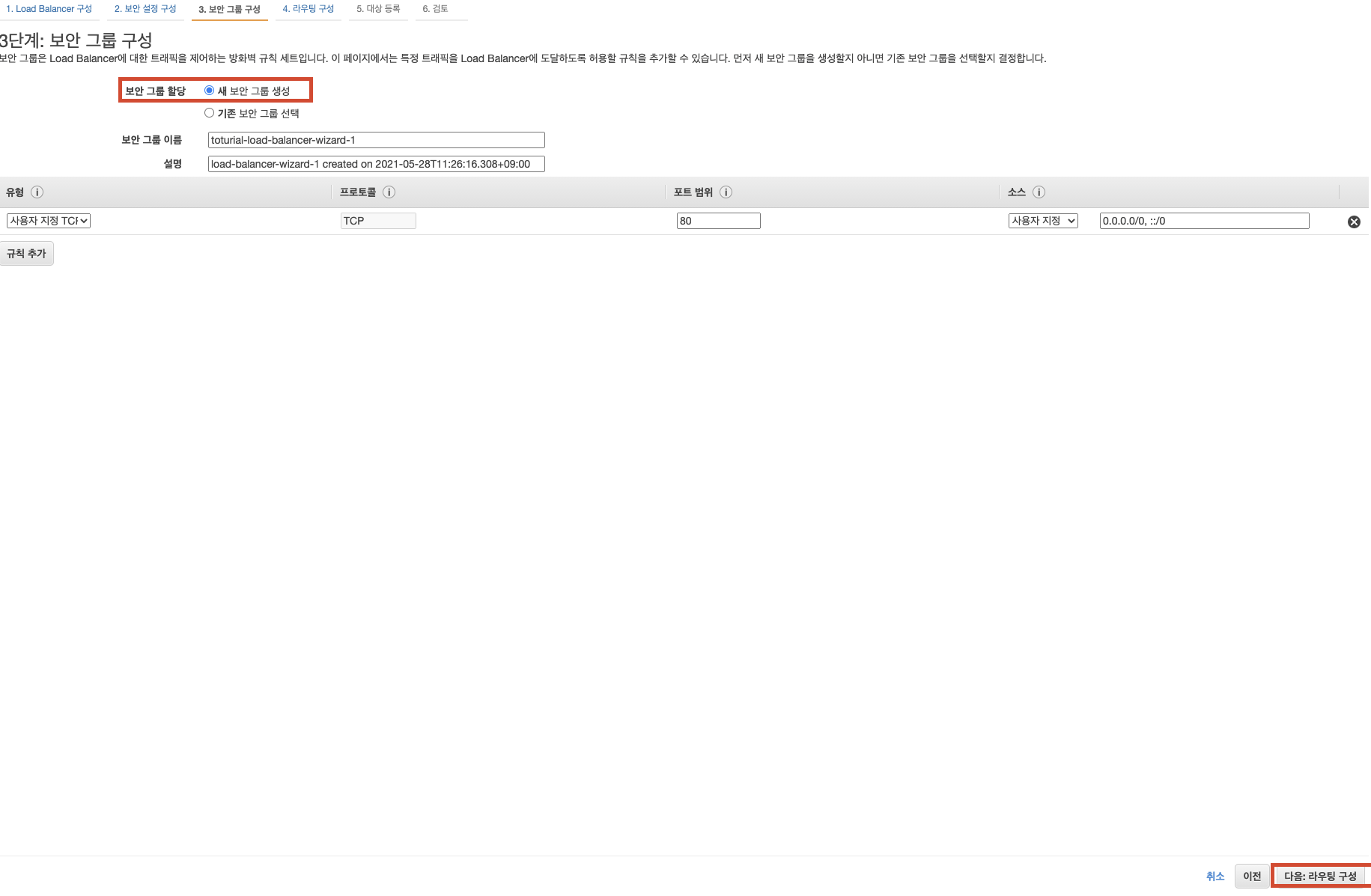 - 기존 보안 그룹이 아닌 [새 보안 그룹 생성]을 하고