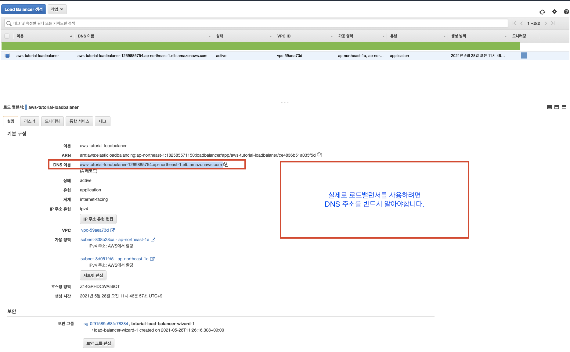 모든 작업을 완료하였습니다. 로드밸런서의 DNS 이름을 보고 접속해봅시다.