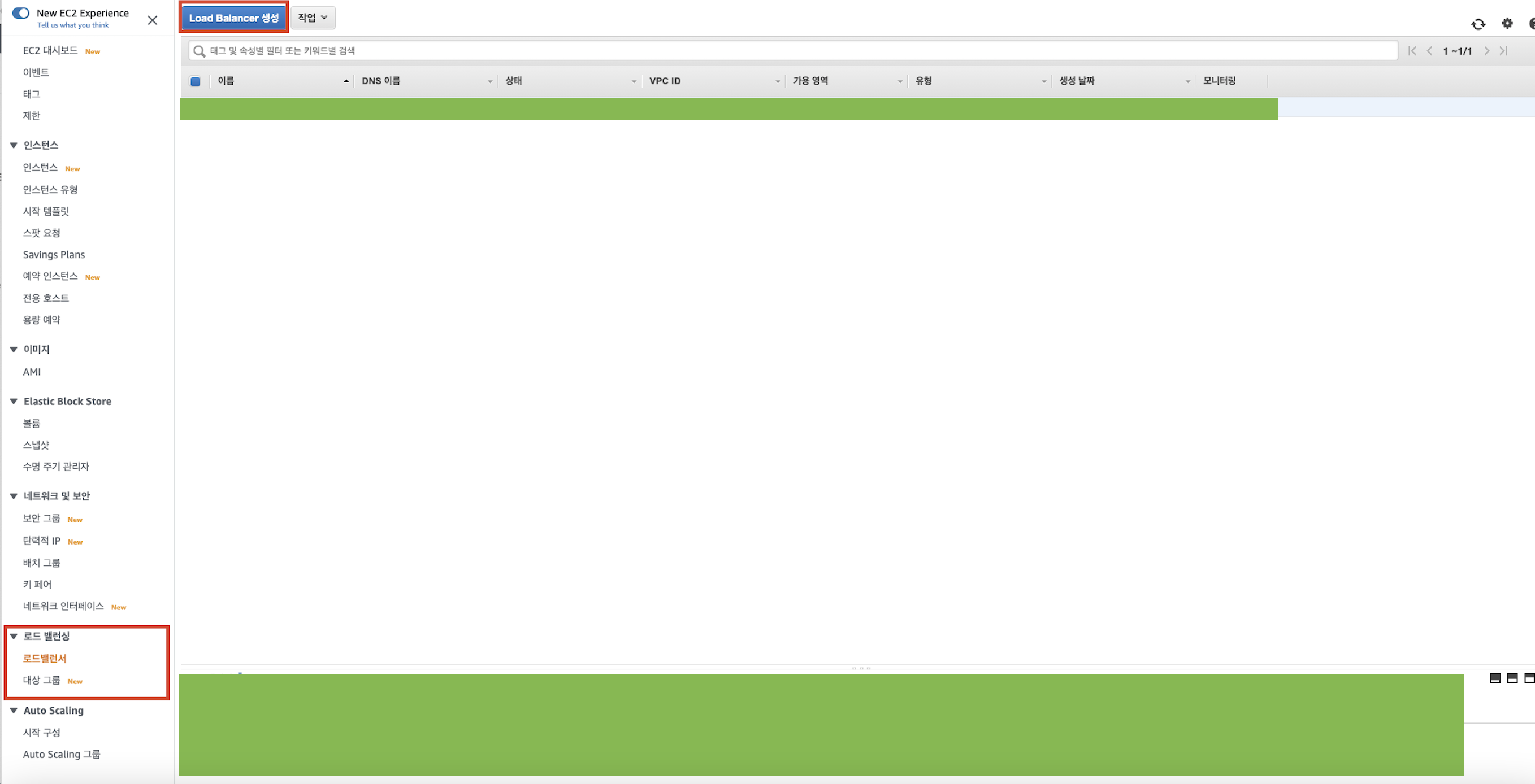 AWS 대시보드 접속 → EC2 대시보드 → 하단 탭 [로드밸러서] 클릭 → [Load Balancer 생성]버튼 클릭