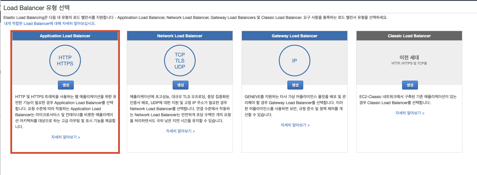 - [Application Load Balancer 생성] 버튼 클릭