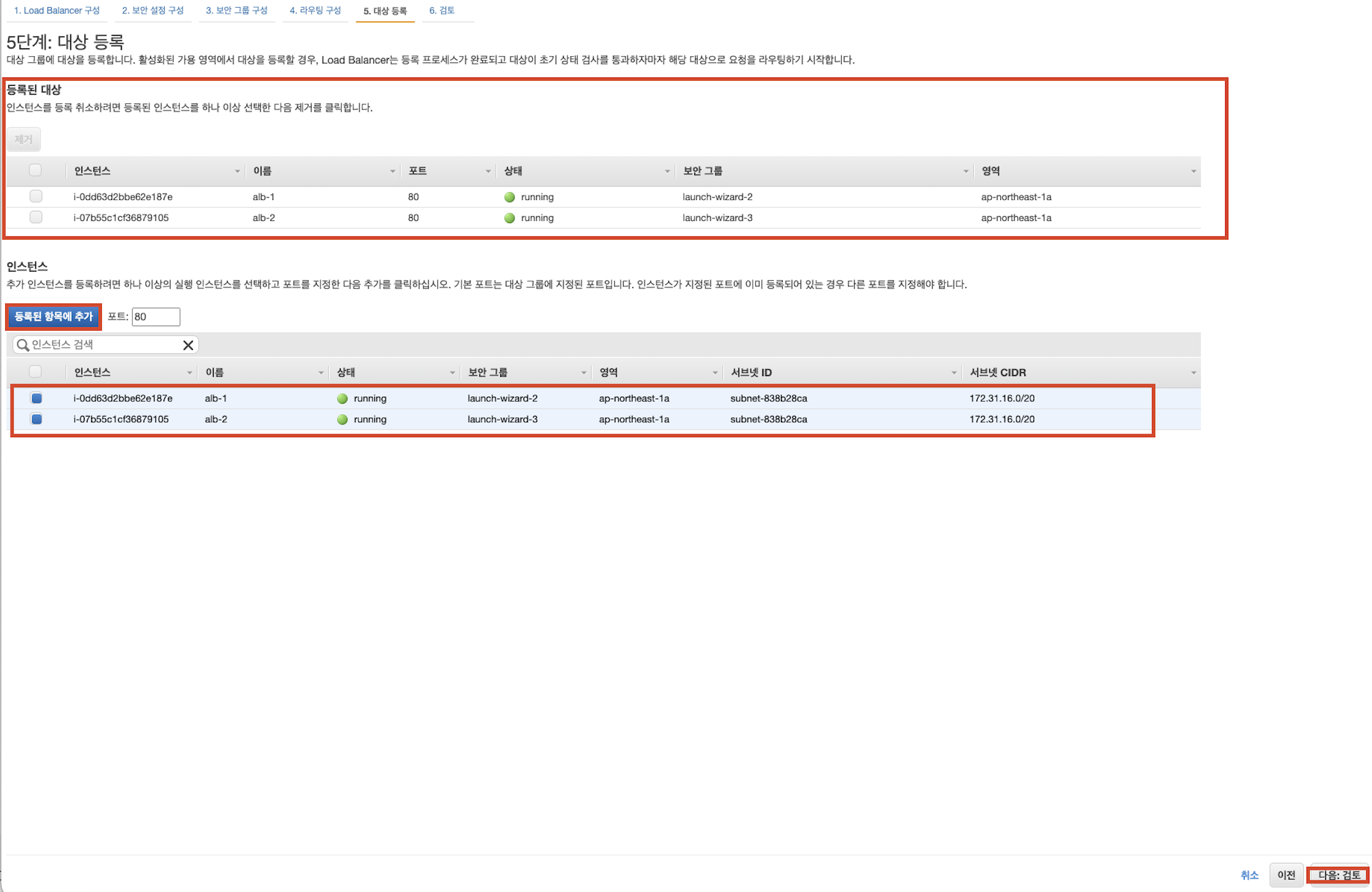 - 등록된 대상에 선택한 인스턴스가 보인다면 [다음:검토]버튼 클릭