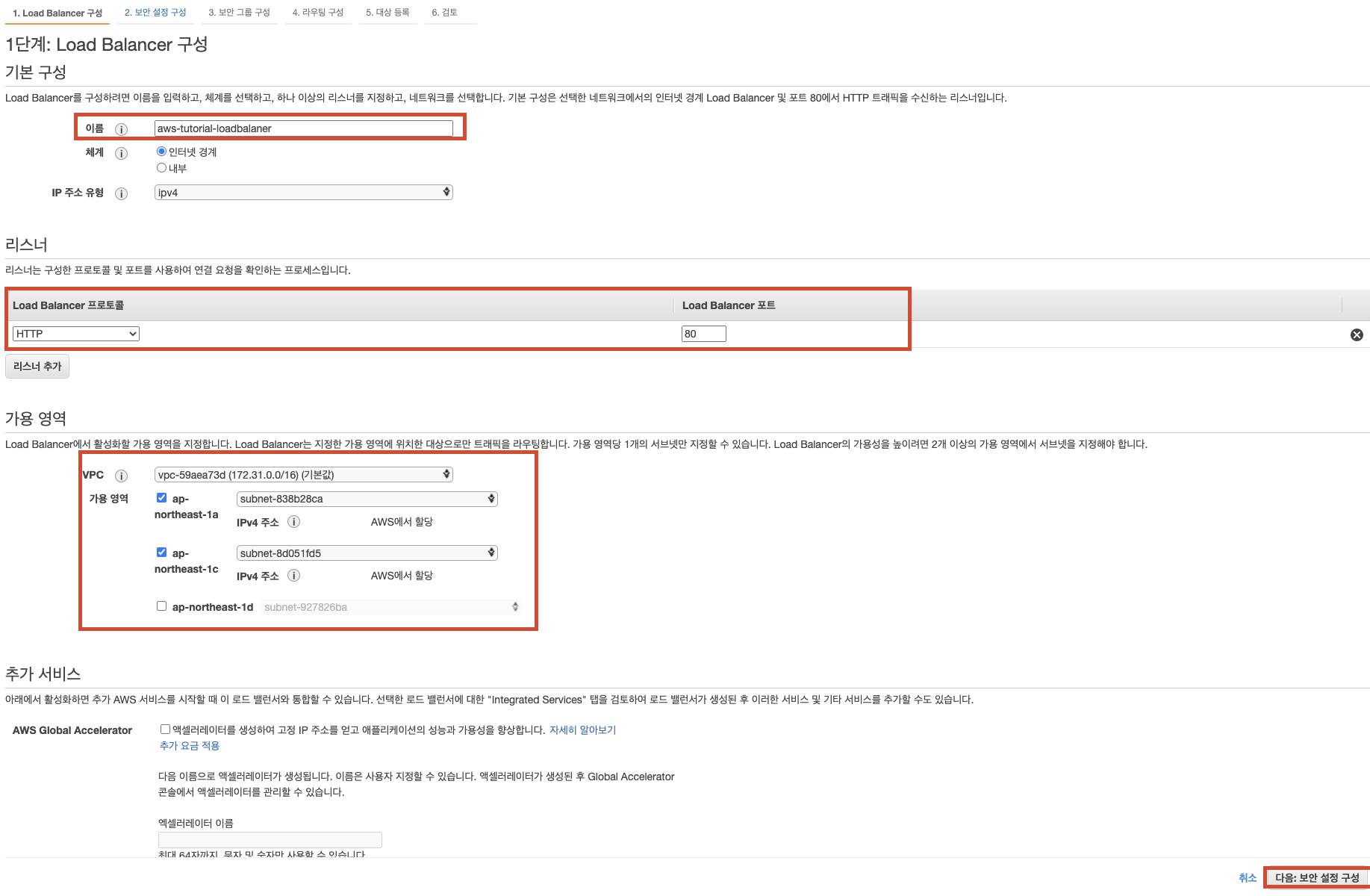 로드밸런서 생성 → 보안그룹 설정 → 타겟그룹 설정 → 타겟등록