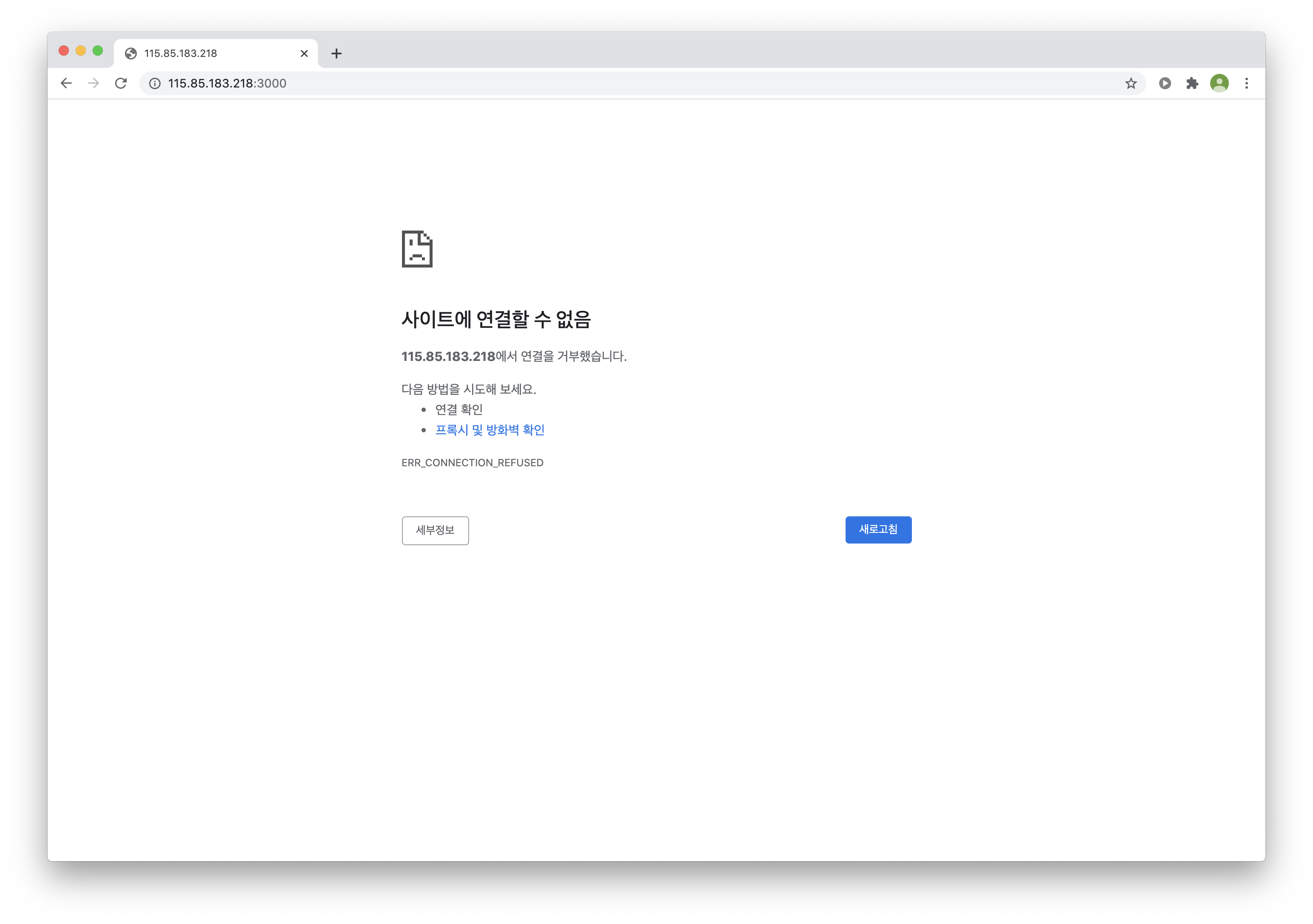 하지만, 터미널을 닫고 브라우저를 새로 고침하면 페이지가 열어지지 않습니다.